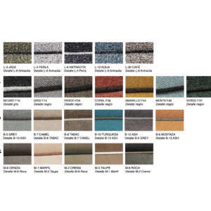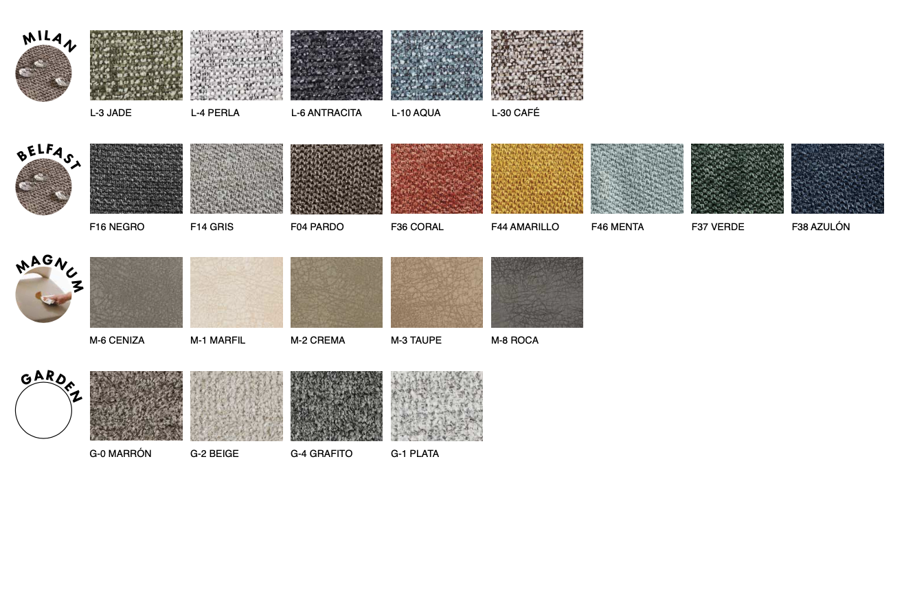 | Tipo de color | MILAN Jade, MILAN Perla, MILAN Antracita, MILAN Aqua, MILAN Café, BELFAST Negro, BELFAST Gris, BELFAST Pardo, BELFAST Coral, BELFAST Amarillo, BELFAST Menta, BELFAST Verde, BELFAST Azulón |
