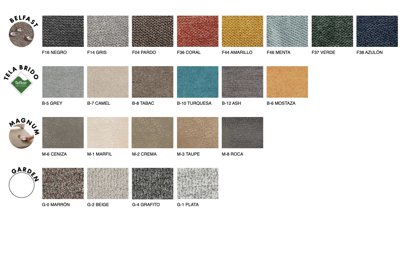 | Tipo de color | BELFAST Negro, BELFAST Gris, BELFAST Pardo, BELFAST Coral, BELFAST Amarillo, BELFAST Menta, BELFAST Verde, BELFAST Azulón |